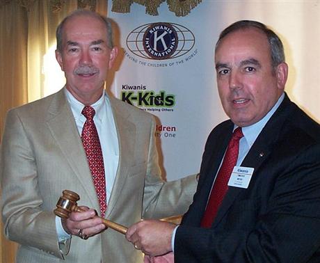 Newly installed President Dr. Steve Staples (left) accepts the gavel of office from Kiwanis Division 23 Lt. Governor Tim Meyer.