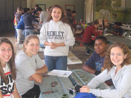 Charlottesville K-Family Kickball Cookout at Camp Holiday Trails. More than fifty volunteers representing members from all five Key Clubs in Division 5A, CKI members from the University of Virginia, and Charlottesville Kiwanians came together on October 3 for a Sunday afternoon service extravaganza at Camp Holiday Trails, a summer camp for children with special health needs. The afternoon began with a cookout presided over by Charlottesville Service Leadership Committee chair Don Foss, shown at the grill being assisted by Monticello High School Key Club Faculty Advisor Diane Clark. The volunteers were then organized by Fifth Division Key Club Lt Gov Diana Stan of Western Albemarle High School, into four teams of ten players each. While two teams played kick ball, two teams engaged in service work including moving tables, chairs, and lawn furniture used at a CHT function the night before, raking leaves, and performing other tasks provided by staff at Camp Holiday Trails. The teams would then alternate activities until all the tasks were accomplished and the kick ball games were concluded. A beautiful Sunday afternoon was spent in K-Family fellowship while accomplishing a much needed set of tasks for one of the area's most popular children's charities.