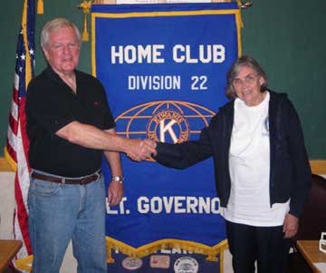 Division 22 Lt. Governor John Buchanan retired from his second term and Millie Kriemelmeyer was installed as Lt. Governor for 2008-2009 at the Division Council Meeting on Sept. 27, 2008. John is a member of the Kiwanis Club of Charlotte Hall and Millie is Past President of the Kiwanis Club of Waldorf. Kelley Jennings was elected Lt. Governor-elect for 2008-2009. Kelley comes from a successful year as president of the Kiwanis Club of Waldorf. Millie and Kelley look forward to helping the Division and District work toward achieving the goals outlined in Governor Tom Ganse's Strategic Plan. For more information, contact Millie Kriemelmeyer: milliek@radix.net. Shown shaking hands are Division 22 PLG John Buchanan and LTG Millie Kriemelmeyer.