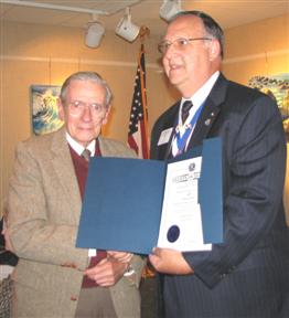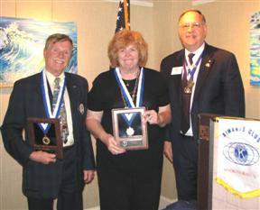 The Rehoboth Beach Kiwanis Club celebrated its 80th Anniversary, using the occasion to recognize members' accomplishments over many years. Gov. Art Riley presented the Legion of Merit to long-time members, PLG Ray Wilson (1969) and Jay Wingate, recognizing them for 45 and 47 years as Kiwanians, and then presented Pres-Elect Ken Drerup the Human and Spiritual Aims Award. Gov. Riley presented Past President James G. Horn, grandson and son of the club's charter members, as a recipient of the prestigious George Hixson Award for his many years of service. The new Awardee and Gov Riley then surprised President Cummings when they also presented her with a Hixson Award. The Club now has awarded eight Hixson's. Then Past Gov Bob Cressy stepped to podium to present Past President George Blacklock and Secretary Rosemary Cummings with the Distinguished Club awards for 2006-07. Past Gov Cressy also recognized PLG Rose Poole as Distinguished Lt. Governor for her service. PLG Poole, representing the Seaford Club, which sponsored the Rehoboth Club in 1928, presented the Rehoboth Club with the banner and flag in opening ceremonies.