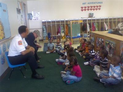 (Fire Captain Harris & Police Officer Eric reading to the Salvation Army 3 year old class)
