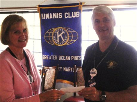 Kiwanis Donates to Berlin Intermediate School. The purpose of Kiwanis is "Serving the Children of the World" which is why the local club donates to local schools. Pictured are Kiwanian Jane Slotter, the club's representative to B.I.S., receiving a $1000 donation from Kiwanis Club of Greater Ocean Pines - Ocean City President-elect Mike Morton to be used for Berlin Intermediate School programs. In addition to B.I.S., the local Kiwanis Club interfaces with local elementary schools and Stephen Decatur High School with support to some of their programs, the biggest of which is annually awarding scholarships to SDHS senior students to further their education.