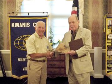 Charles Jones, aka the "Bike Doctor", was the Guest speaker at the dinner and Board meeting of the Mount Vernon Kiwanis Club (MVKC) at the Mount Vernon Country Club on August 19. Assisted by MVKC member Richard Peterson, Charles recently donated and delivered 27 bicycles that he had renovated to the children in the Creekside Neighborhood Center, which the MVKC supports in various ways. Pcitured: Charles Jones receiving the much-coveted MVKC cap from MVKC President Bruce Malkin after the thoughtful presentation.