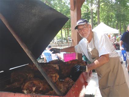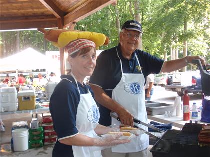 You can always count on the Kiwanis Club of Greater Ocean Pines - Ocean City to busy raising funds for scholarships around Ocean Pines/Ocean City. On August 7th they held their 7th Annual Carolina Pork BBQ in conjunction with the Craft Fair at Whitehorse Park in the Pines. Pictured above is Kiwanis member, Phil Lassiter who has organized the event and been the main man at the roasting pit since the start. The club also called out the "Dog Team" (right) to sell hot dogs which Kiwanians Mary Foelber and Charlie Warner are pictured grilling.