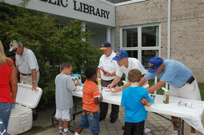 Volunteers from the Kiwanis Club of Poquoson pitched in to help the Poquoson Public Library and local kids celebrate the end of the library's Children's Summer Reading Program. The library sponsored a picnic with entertainment for kids in their annual reading program. Kids, parents, and library staff joined in for a morning of fun at the library.  Volunteers from the Kiwanis Club of Poquoson cooked up and served 240 meals with hot dogs, snacks, and drinks.
