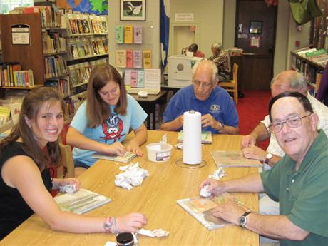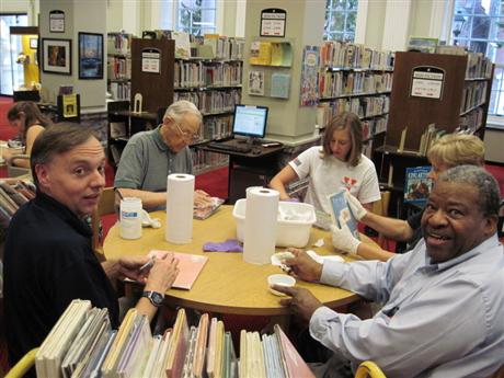 Participating in one of their most favorite "Service Work Nights," twenty-five members of the Charlottesville Kiwanis Family cleaned and refurbished hundreds of well-used children books at the Jefferson-Madison Regional Library on Monday, August 29, 2011. "The Kiwanians always do such a tremendous job that we asked them to come back again at their earliest opportunity," said Krista Farrell, Assistant Director of JMRL and Central Branch Manager. Fifteen Kiwanis Club members were joined by eight members of the CKI Club at the University of Virginia alongside two leaders of the Key Club at Albemarle High School on this special "fifth Monday service work night." After accomplishing the tasks assigned to them by Karen Gillaspie, Children's Library Director, the group went upstairs to the Jefferson Room to enjoy a sumptuous meal prepared by the students in the culinary arts program at the Charlottesville-Albemarle Technical Education Center (CATEC). Service Work Night committee chair Charlie Krizek was commended for leading the K-Family volunteers in helping the library put good clean books in the hands of Charlottesville's eager young readers.